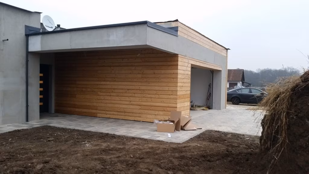 Na projektu, ki ga predstavljamo je prezračevana lesena fasada iz sibirskega macesna, fasada je premazana z zaščitnim oljem, saj bo tako les bolj enakomerno dobival srebrno sivo patino.Sprememba barve je naraven proces, ki ne vpliva na kakovost ali trajnost lesene fasade. Če želite ohraniti prvotno barvo lesa je potrebno premaz obnavljati.