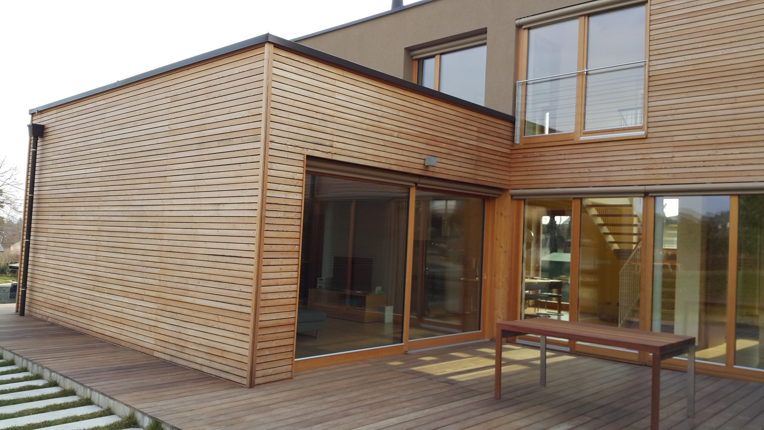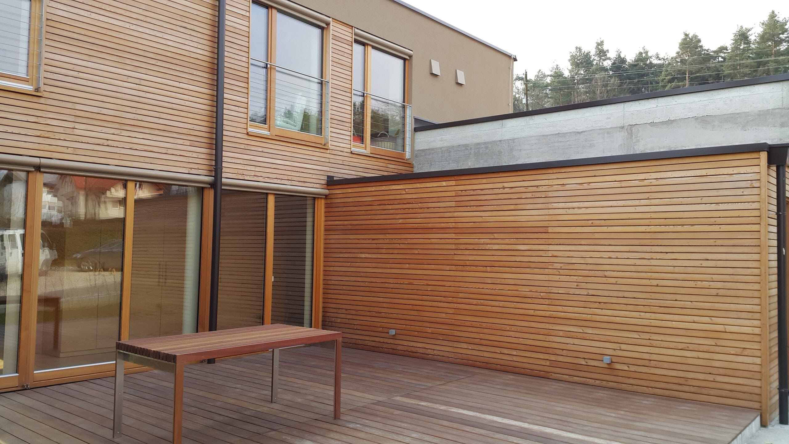 Predstavljeni projekt smo izvedli v mariboru. Lesena fasada je narejena na alu sidra, ki preprečujejo toplotne mostove klasične izvedbe, pa tudi izvedba je hitrejša in cenejša. Leseno teraso smo izvedli iz tropskega lesa cumaru, ki je eden redkih, ki se dobro obnaša v naših klimatskih pogojih. Terasa je bila izvedena zlastnim klip lpx 185 nevidnim sistemom pritrjevanja, in sicer z gladkimi podnicami