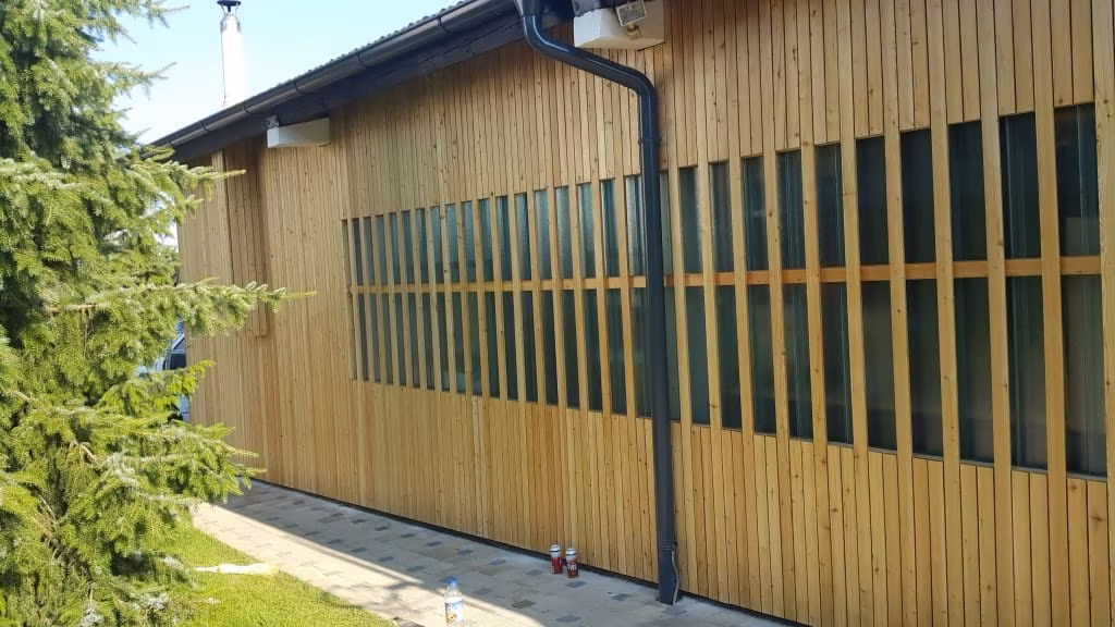 Pri tem projektu smo obdelali steno skladišča, ki meji na hišo investitorja projekta. Uporabljena je bila letvica 24×70 mm romb oblike, iz sibirskega macesna. Fasada je bila izvedena z lastno razvitim nevidnim sistemom pritrjevanja Klip lpx 185 in zasčitena z osmo oljem.