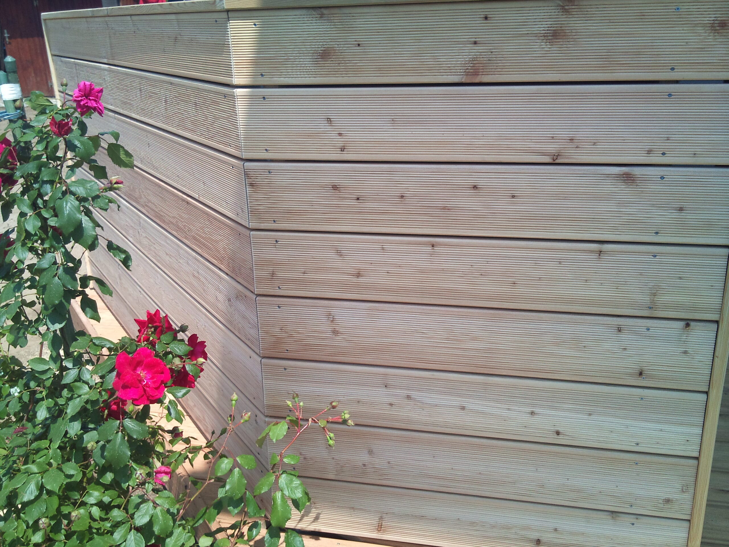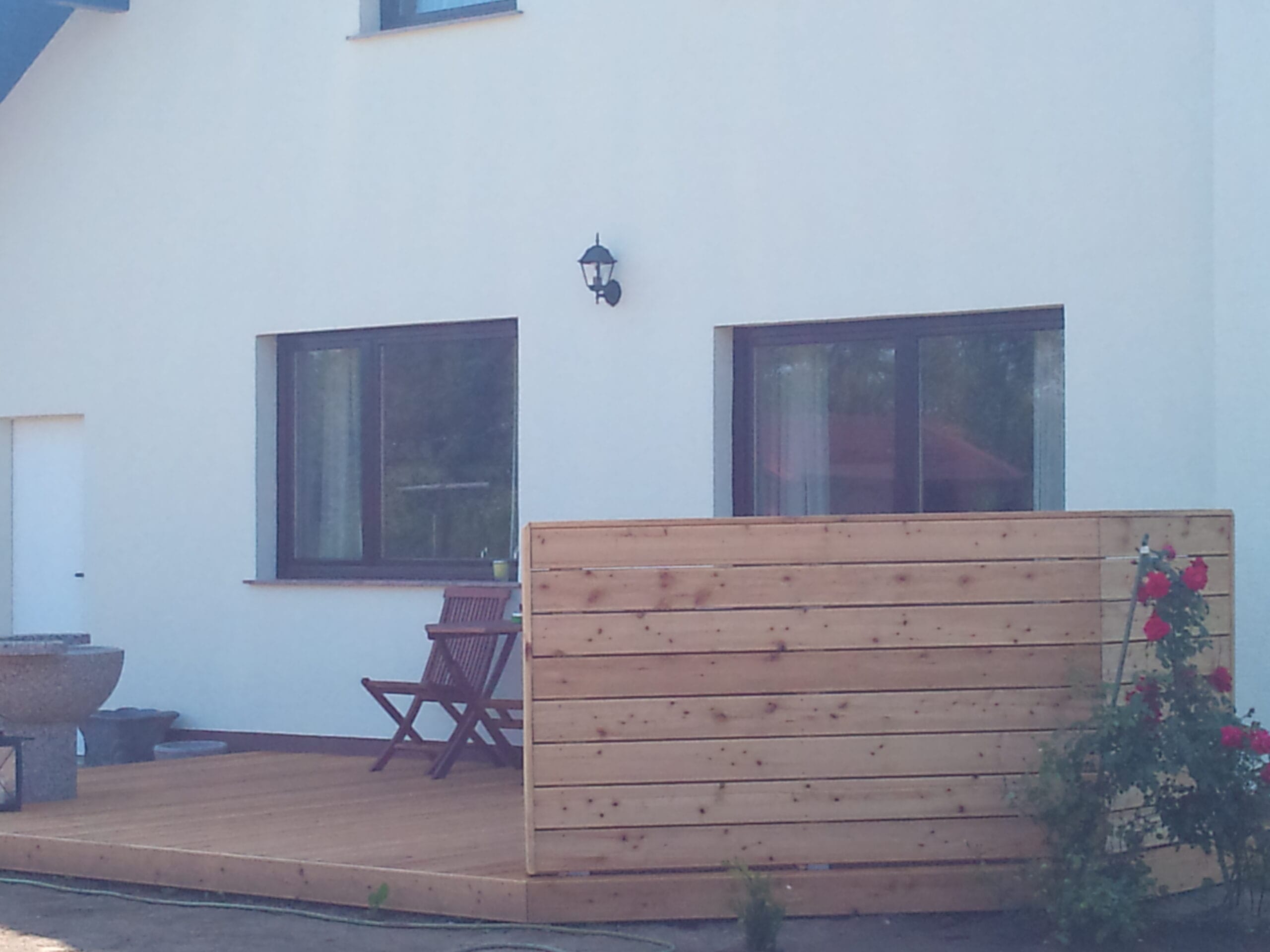 Tokrat predstavljena lesena terasa, je izvedena na betonsko ploščo in vijačena z namenskimi solida RF vijaki, s predvrtalno glavo, ki poskrbijo da les, kljub vidnemu vijačenju ne poka, oblika glave pa poskrbi za enakomerno nasedanje na les. Posebnost lesene terase je klopca, narejena, na kovinsko konstrukcijo, ki je hkrati zaščita pred radovednimi pogledi.